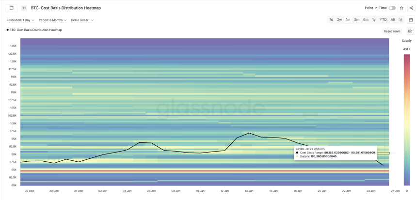 A cost-basis heatmap shows price levels where large amounts of Bitcoin were previously bought. These zones often act as resistance because holders sell when the BTC price returns to their break-even levels.