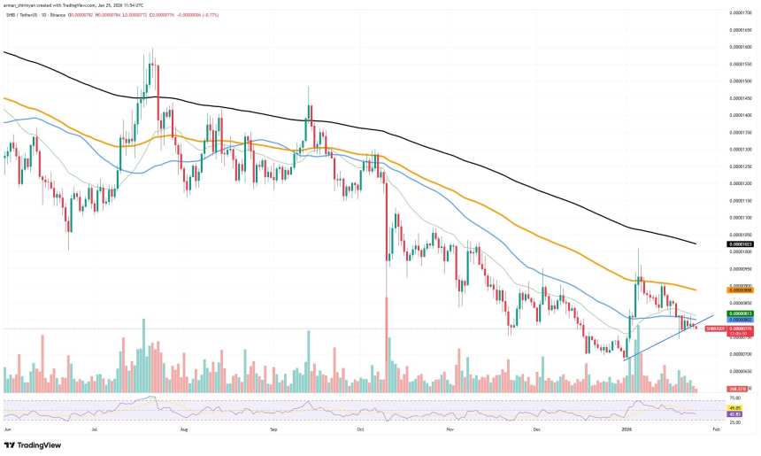 The same stalemate is reflected in momentum indicators, which show no divergence, no stress and no urgency as the RSI continues to hover in neutral territory. This type of behavior typically suggests that the market is waiting for an external catalyst, such as an unexpected capital inflow or a broader market shift that forces reallocation into high-beta assets like SHIB.