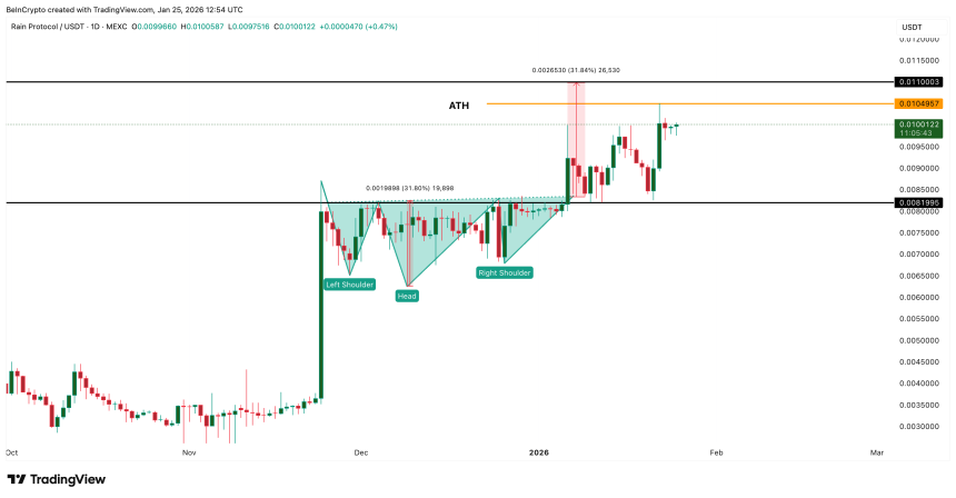 The active breakout inverse head-and-shoulders structure projects a new all-time high more than 10% above current prices, near the $0.0110 zone. That projected level, not the prior peak, is where traders are positioning. The current consolidation is not about profit-taking at old highs. It is about whether RAIN can expand into its next leg.