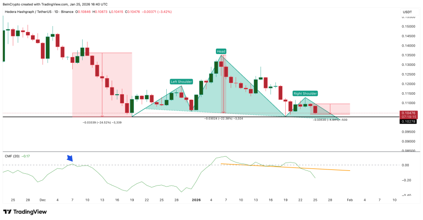 The price chart shows Hedera moving closer to completing a head-and-shoulders pattern. It often signals a bearish reversal once the neckline breaks.