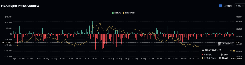 Spot exchange data shows that net outflows have picked up over the past two days as the HBAR price corrected by almost 5%. Net outflows occur when more tokens leave exchanges than enter, which usually signals buying or long-term holding. On January 24, net outflows stood near $1.41 million, rising to roughly $1.60 million on January 25. This suggests dip buyers are stepping in after recent selling.