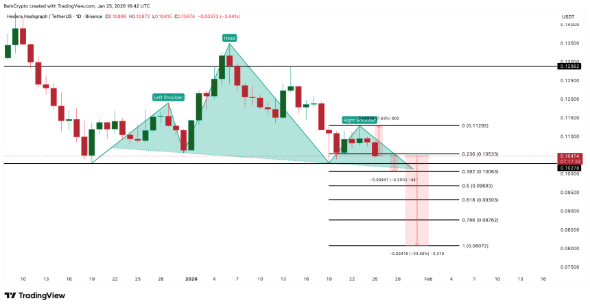 For the HBAR price, the neckline sits near $0.102. A daily close below this level would activate a projected downside move of more than 20%, aligning with prior breakdowns from similar structures.