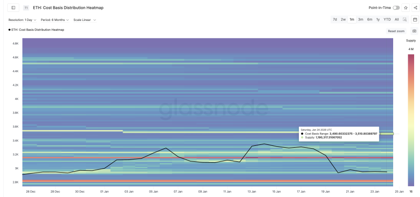 Cost-basis data shows a large cluster of Ethereum holders between $3,490 and $3,510. Roughly 1,190,317 ETH were accumulated in this zone. At an average price near $3,500, that represents about $4.1 billion in supply.