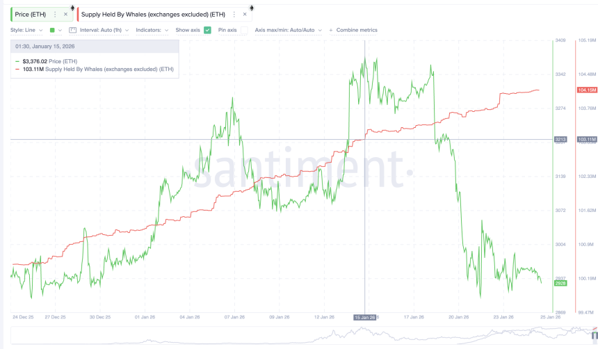 From January 15 onward (post-breakout confirmation), large holders steadily increased exposure. Whale balances rose from roughly 103.11 million ETH to 104.15 million ETH, an addition of about 1.04 million ETH or close to $3 billion.