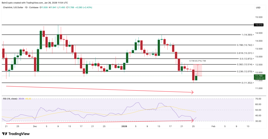 The chart adds to this picture. Between late November and January 25, Chainlinks price printed a lower low, while the Relative Strength Index (RSI) formed a higher low.