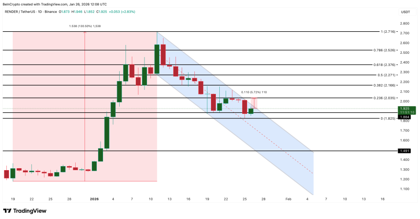 On the chart, RENDER is consolidating within a falling channel after a sharp 130% rally from December 19 to January 11. While the channel remains intact, price is now pressing against its upper boundary. A move above $2.03 would break the channel and turn the structure neutral to bullish.