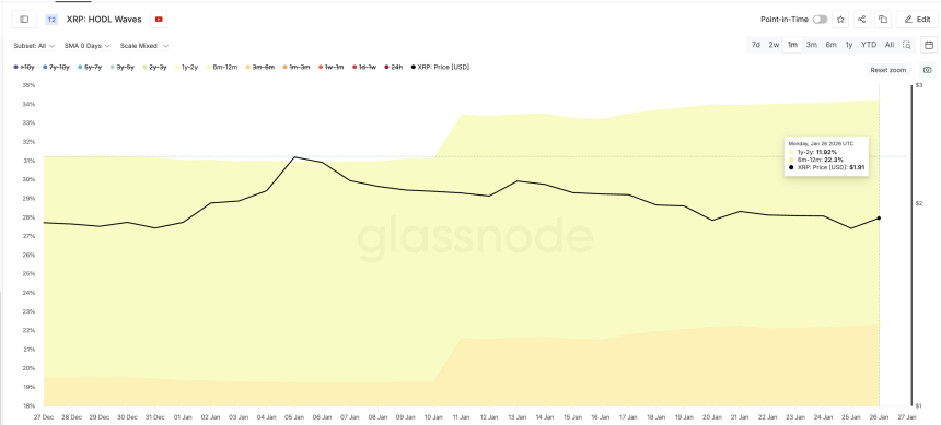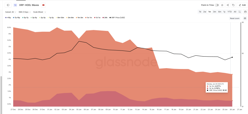 One of the clearest changes is visible in XRPs HODL waves. The HODL Waves metric shows how long coins have been held, helping separate short-term traders from long-term conviction holders.