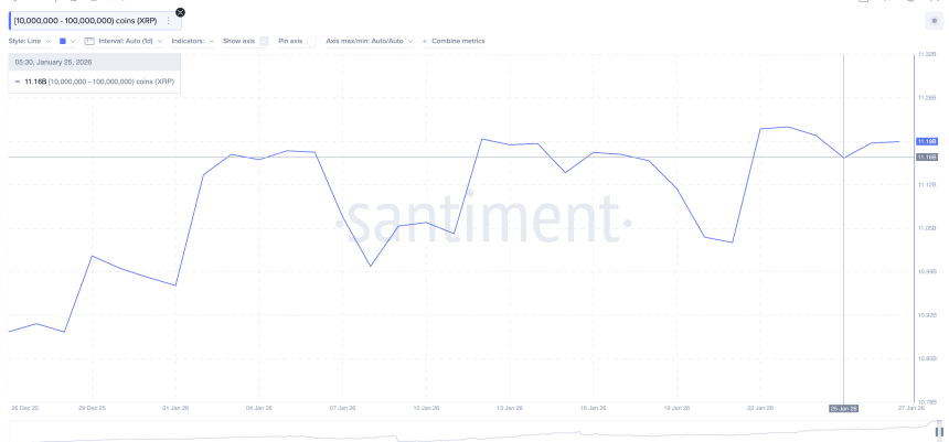 Large holders appear to be positioning for that sequence. For instance, wallets holding between 10 million and 100 million XRP increased their combined balances from about 11.16 billion to 11.19 billion tokens after January 25.