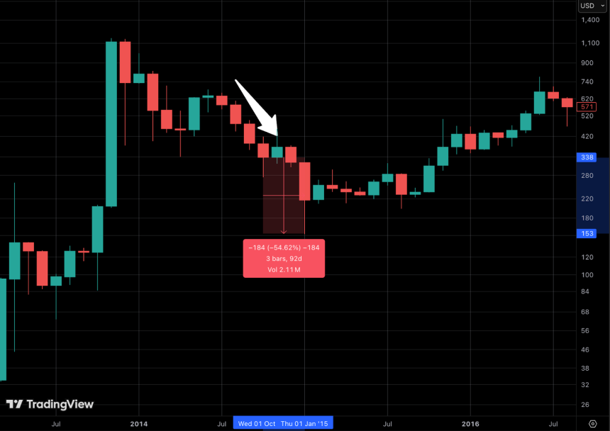 What stands out, however, is how rarely Bitcoin has printed four consecutive monthly red candles. Notably, the last time this happened in 2018, Bitcoin did not end its streak of red months with the fourth. Instead, Bitcoin went on to see a further ~20% decline with two more red months. A similar setup played out in 2015, where losses ultimately approached close to 60% after the four month red streak.