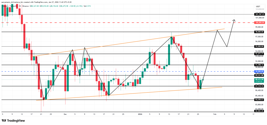 From a technical standpoint, Bitcoin price remains inside an ascending broadening wedge. Price recently bounced from the lower boundary of this structure and is now trading near $88,475. The immediate task for bulls is to clear $89,241 and reclaim the psychological $90,000 level. Acceptance above $90,000 would signal improving short-term momentum and confirm strength within the pattern.
