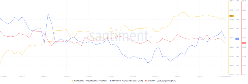 Meanwhile, wallets holding between 1 million and 10 million ADA, as well as those with 100,000 to 1 million ADA, experienced a temporary slowdown in demand, although accumulation resumed in January 2026.