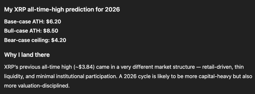 ChatGPT‘s projection is based on a structural comparison between past and future market cycles. The model noted that XRP’s prior all-time high occurred in an environment characterized by thinner liquidity and limited institutional participation.