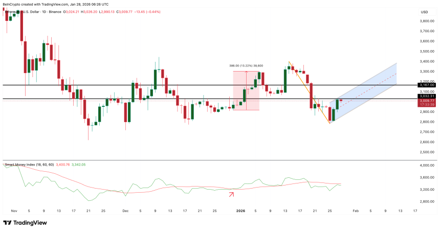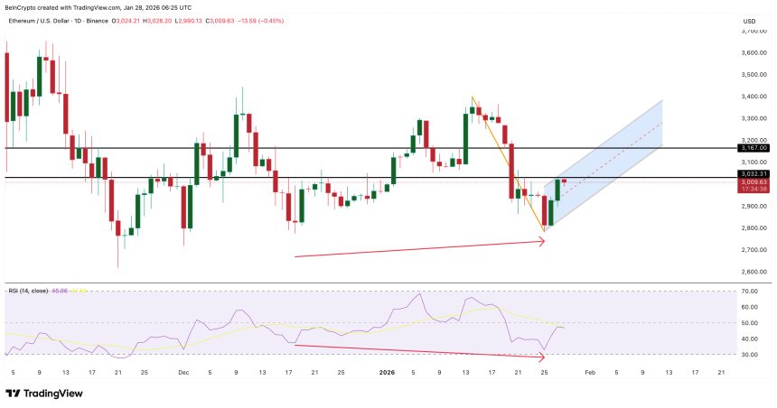 Without that confirmation, the pattern remains potential energy, not a trigger. On the downside, dipping under $2,930 weakens the case. However, losing $2,780 would invalidate the double bottom structure and open lower Ethereum price levels.
