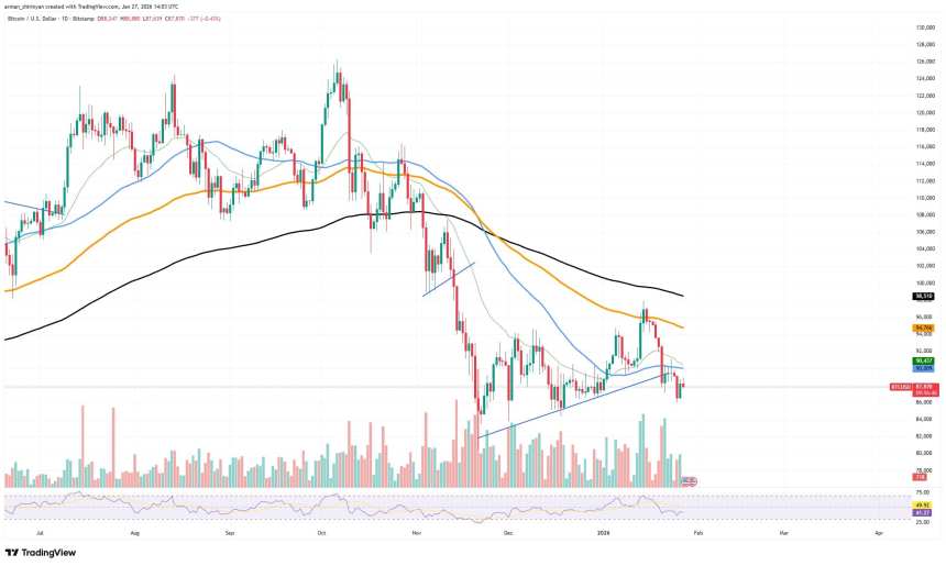 Key levels are now highlighted. BTC is currently hovering around immediate support, which is between $87,000 and $88,000. A clear breakdown below this range opens the door to $84,000, which is followed by a more crucial support area that used to be a demand zone between $80,000 and $82,000. The market could accelerate into a more profound corrective phase if that level fails.
