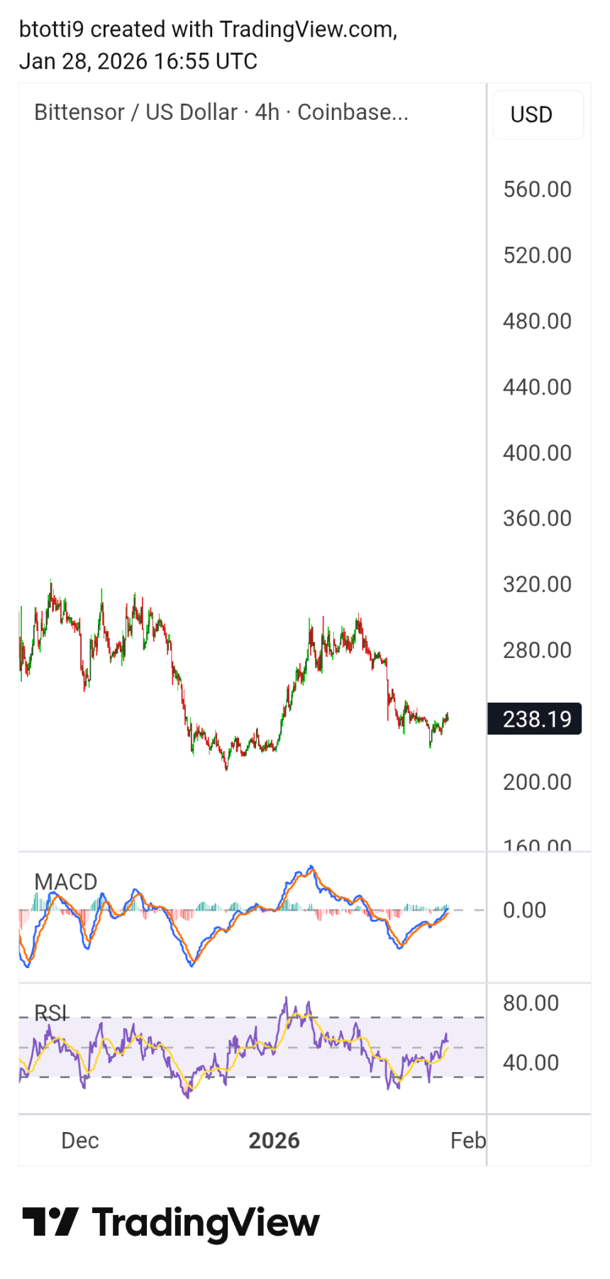 On the 4-hour chart, Bittensor sports positive momentum indicators, including RSI recovery and MACD.
