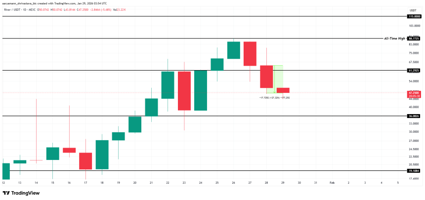 River recorded the sharpest decline among major altcoins, dropping 27% over the past 24 hours. The sell-off pushed the $RIVER price down to $47 at the time of writing. This move followed a decisive breakdown below the $61 support level, signaling weakening short-term momentum and elevated downside risk.