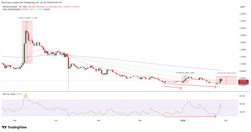 That signal already played out. Since the January 25 low, the Worldcoin price has climbed close to 50%, outperforming most major altcoins over the same period.
