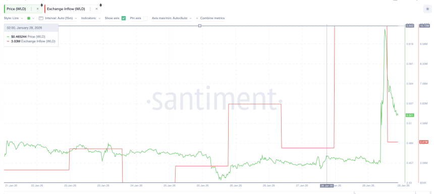 Exchange inflows jumped sharply during the surge. Inflows rose from roughly 0.83 million $WLD to a peak near 10.7 million $WLD in a short window. At a current price near $0.53, that represents over $5.6 million worth of tokens moving toward exchanges, possibly by underwater traders. That supply helped cap the rally.
