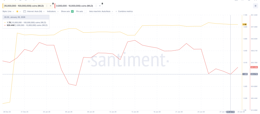 Wallets holding 10 million to 100 million $WLD began accumulating around January 15, well before the OpenAI reports. Their combined holdings rose from roughly 1.67 billion to 1.70 billion $WLD, an increase of about 30 million tokens, worth roughly $15.9 million.