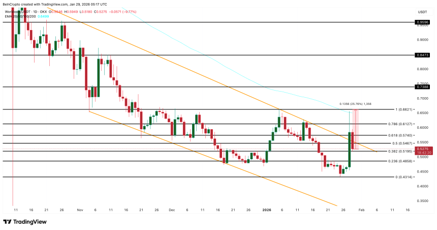 On the upside, Worldcoin must reclaim $0.66 on a daily close, a 25% move from the current levels. That level aligns with the 100-day EMA, which rejected the price during the recent spike. A clean move above it opens upside toward $0.73, $0.84, and potentially $0.95 if momentum builds.