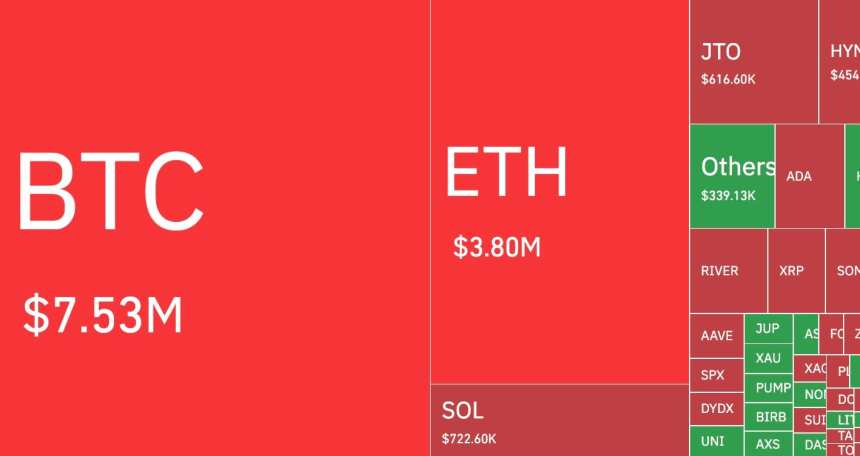 The largest liquidation order occurred on Hyperliquid — a $13.25 million $BTC/USD short that was instantly torched as the price increased. In total, $7.53 million in $BTC liquidations were recorded for the hour, with 98.5% targeting shorts. ETH, SOL and JTO followed behind in losses, but Bitcoin's asymmetric imbalance is unmatched in scale.