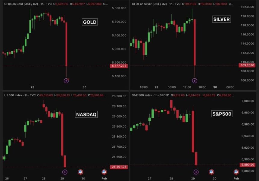 Today, gold and silver prices crashed nearly 10%, wiping out over $3 trillion in value, an amount equal to the entire crypto market cap. The sudden fall quickly spread to crypto, pulling Bitcoin down nearly 7% as leveraged positions were wiped out.