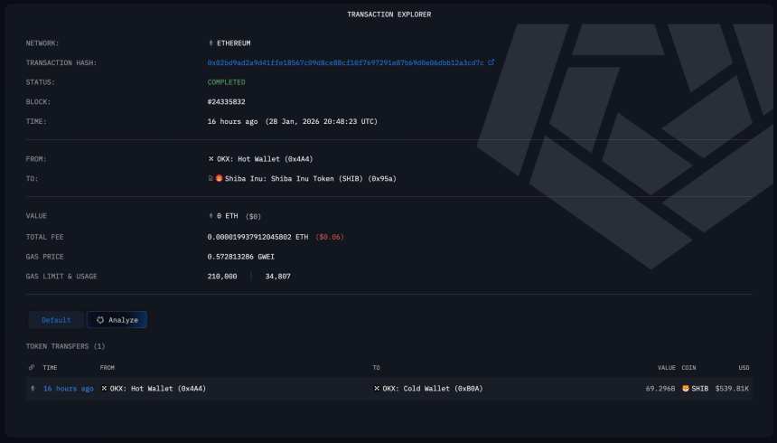 The coins — worth over $500,000 at the current market rate — disappeared from a hot wallet ending in 0x4A4 and reappeared in OKX's internal cold vault (0xBOA), via the official Shiba Inu contract (0x95a), in a transaction first spotted on Ethereum by Arkham data.
