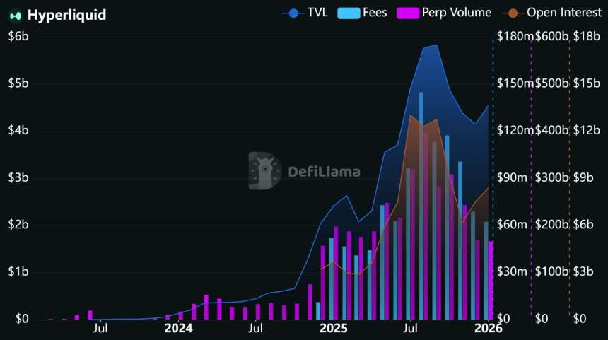 The dynamic is new because the scale is new. Hyperliquid processed $165.9 billion in monthly perpetual volume and carries an open interest of $8.4 billion, according to DefiLlama.