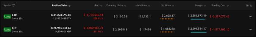As for the $XRP position, which has over 14.8 million tokens at a $2.29 entry, it is currently at $1.7441, with a liquidation zone just cents below at $1.666487. Unrealized loss is at $8.13 million, and funding costs are eroding a further $1.51 million.