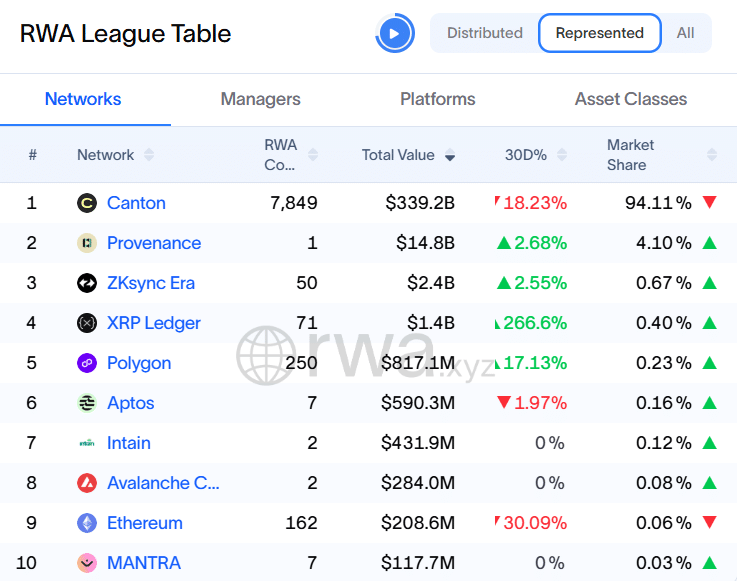 For context, XRPL now towers over heavyweights such as Ethereum and Polygon, only behind Canton, Provenance, and ZKSync Era in this metric. Specifically, Polygon holds $817.1 million worth of represented RWA, sitting just below the XRPL at fifth. Meanwhile, Ethereum holds only $208.6 million, currently sitting ninth.