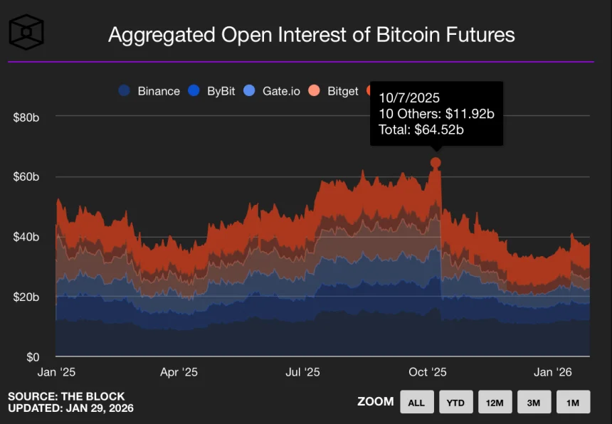 Another important factor helping explain Bitcoins consolidation is the steady release of derivatives pressure. Over the last year, aggregate open interest in Bitcoin futures across the top 15 centralized exchanges peaked at approximately $64.52 billion on October 7, showing a heavily leveraged market with elevated speculative positioning.