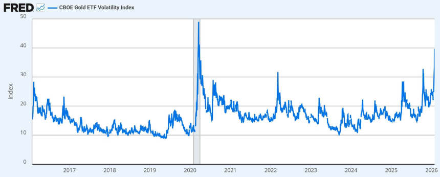 Meanwhile, the speed of gold's uptrend is now showing up in its volatility. The CBOE Gold ETF Volatility Index (GVZ) increased from 30.01 on Jan. 23 to 39.67 on Jan. 28.