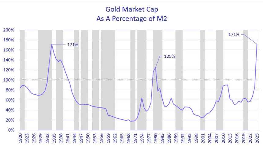 She noted that the ratio of gold to the US money supply (M2), which stands at about $22.69 trillion, recently reached levels reminiscent of those in 1980 and the Great Depression.