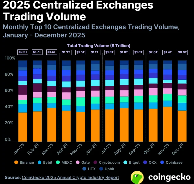 CoinGeckos overall exchange report showed that 2025 was generally a positive year for centralized crypto trading. Six of the top ten exchanges increased their annual trading volumes, with overall volumes rising an average of 7.6% across the group, translating to roughly $1.3 trillion in additional trades.