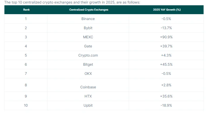 Four exchanges posted double-digit growth rates, led by MEXC, which recorded the fastest expansion. MEXCs trading volume surged 91% year-over-year to approximately $1.5 trillion, up from $766.7 billion in 2024, largely driven by its aggressive zero-fee spot trading policy.