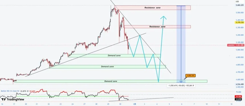The attached chart showed spot gold near $5,064, with two resistance zones drawn around the $5,300 area and again closer to the upper $5,500s. Below price, the analyst highlighted multiple demand zones, including one around the high $4,800s to low $4,900s, another near the upper $4,700s, and a deeper band near the mid $4,500s. A projected path on the chart traced repeated rebounds and renewed selloffs before any larger recovery attempt.