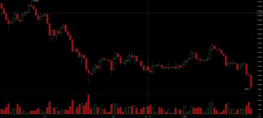 If price can stabilize above the $78,000–$79,000 zone and begin reclaiming the lower Bollinger Band, conditions could emerge for a short-term relief bounce as selling pressure cools from extreme levels. Failure to hold that area, however, would keep the market vulnerable to continued downside extension, particularly if elevated volume and negative momentum persist. Until momentum indicators begin to recover and price can work back above broken support near $80,000, the technical bias remains firmly skewed toward further weakness.