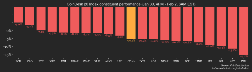 Speaking of markets, over the weekend bitcoin fell to under $75,000, with the broader market following suit. Almost all crypto market sub-sector indices are now down 15% or more this year, according to CoinDesk Indices.