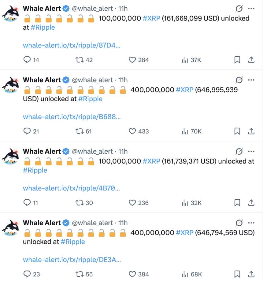 According to on-chain data, the unlocks were split across four transfers of 100 million, 400 million, 100 million, and 400 million $XRP, with a combined value of approximately $1.6 billion at the time of execution.