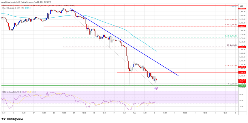 WikiBit 2026-02-02 12:02Ethereum price started a major decline after it failed to clear $2,500. $ETH is down 20% and is now