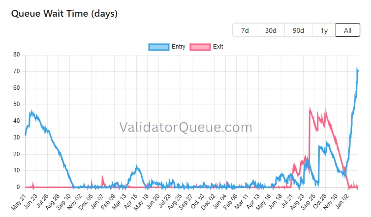 The validator queue holds over 4M $ETH waiting to be deposited to the contract, with almost no waiting for withdrawals. The waiting time accelerated to an all-time high and is now close to 71 days.