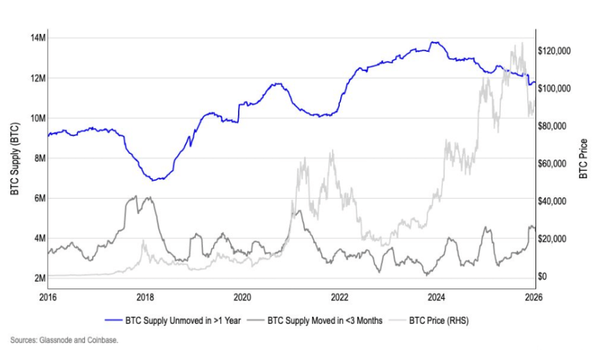 The report also notes that, in the fourth quarter of 2025, $BTC that moved within three months rose by 37%, while $BTC that remained unmoved for more than a year fell by 2%, which the authors interpret as a distribution phase late in 2025.