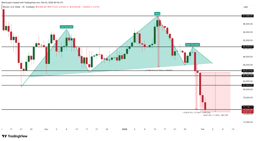 In late January, the price broke below a head-and-shoulders pattern, confirming a bearish reversal. The breakdown on January 29 projected a downside target near $75,130. By early February, Bitcoin had reached this zone, validating the pattern almost perfectly.