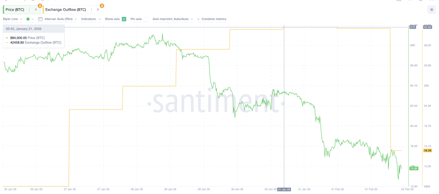 Exchange outflows, which track how much Bitcoin is being moved off trading platforms into long-term storage, have fallen sharply. Around January 31, outflows stood near 42,400 $BTC. After the sell-off, they dropped to about 14,100 $BTC, a decline of nearly 67%.