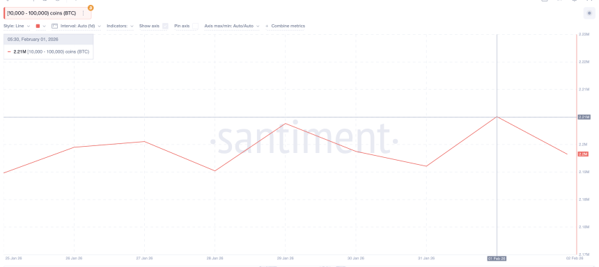 Whale behavior adds to the concern as the second warning metric. Wallets holding between 10,000 and 100,000 $BTC have been reducing exposure since February 1. Their combined holdings fell from around 2.21 million $BTC to 2.20 million $BTC. That represents roughly 10,000 $BTC sold, worth about $750 million near current prices.