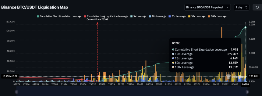 Liquidation data from Binance shows cumulative short leverage near $1.91 billion, while long positions have fallen to around $168 million. This creates a massive imbalance in favor of bearish bets.