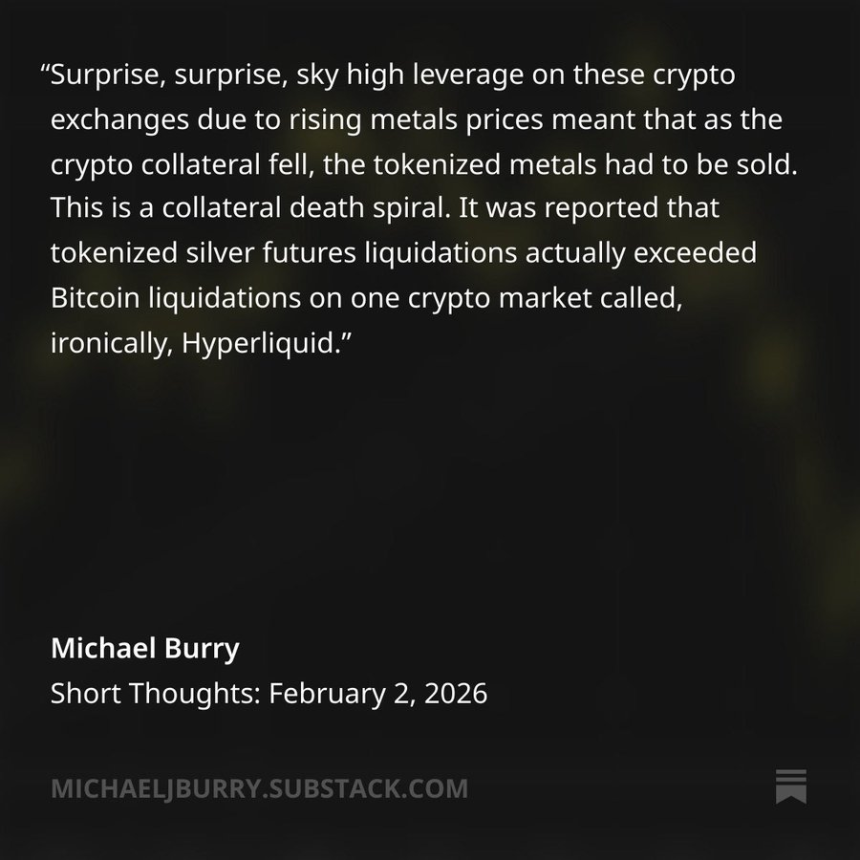 Burry pointed to the same dynamic in a note this week, characterizing it as a “collateral death spiral” in which falling crypto prices and heavy leverage triggered liquidations in tokenized metals and digital assets.