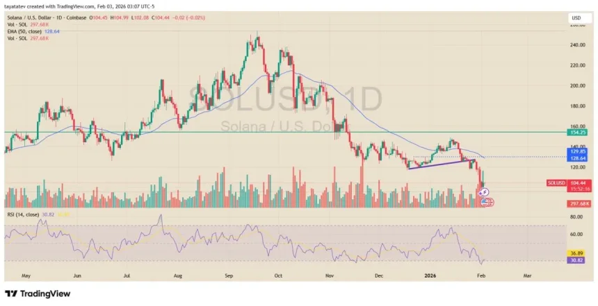 The shared “$SOL daily chart” shows a steady downtrend from the mid-January area, followed by a sharp late-month drop that pushed price to about $104.92 before a small rebound attempt.