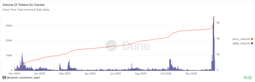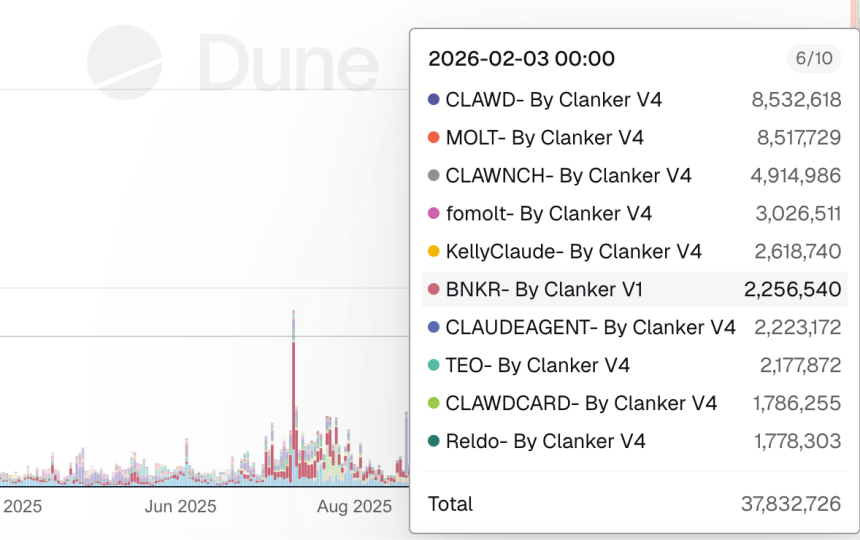 Since Jan. 30, trading volume on Clanker has mostly been led by the Moltbook-inspired memecoin Moltbook (MOLT). At its peak, MOLT was trading with a $93 million market cap, while trading volume for the memecoin reached over $100 million within the first 24 hours of launching on Jan. 30-31, per Dune data. Currently, its market cap stands at $25.7 million and the token is down 23% on the day.