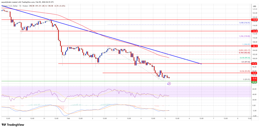 The price gained bearish momentum below $92. A low was formed at $89, and the price is now consolidating losses with a bearish angle below the 23.6% Fib retracement level of the downward move from the $106 swing high to the $89 low.